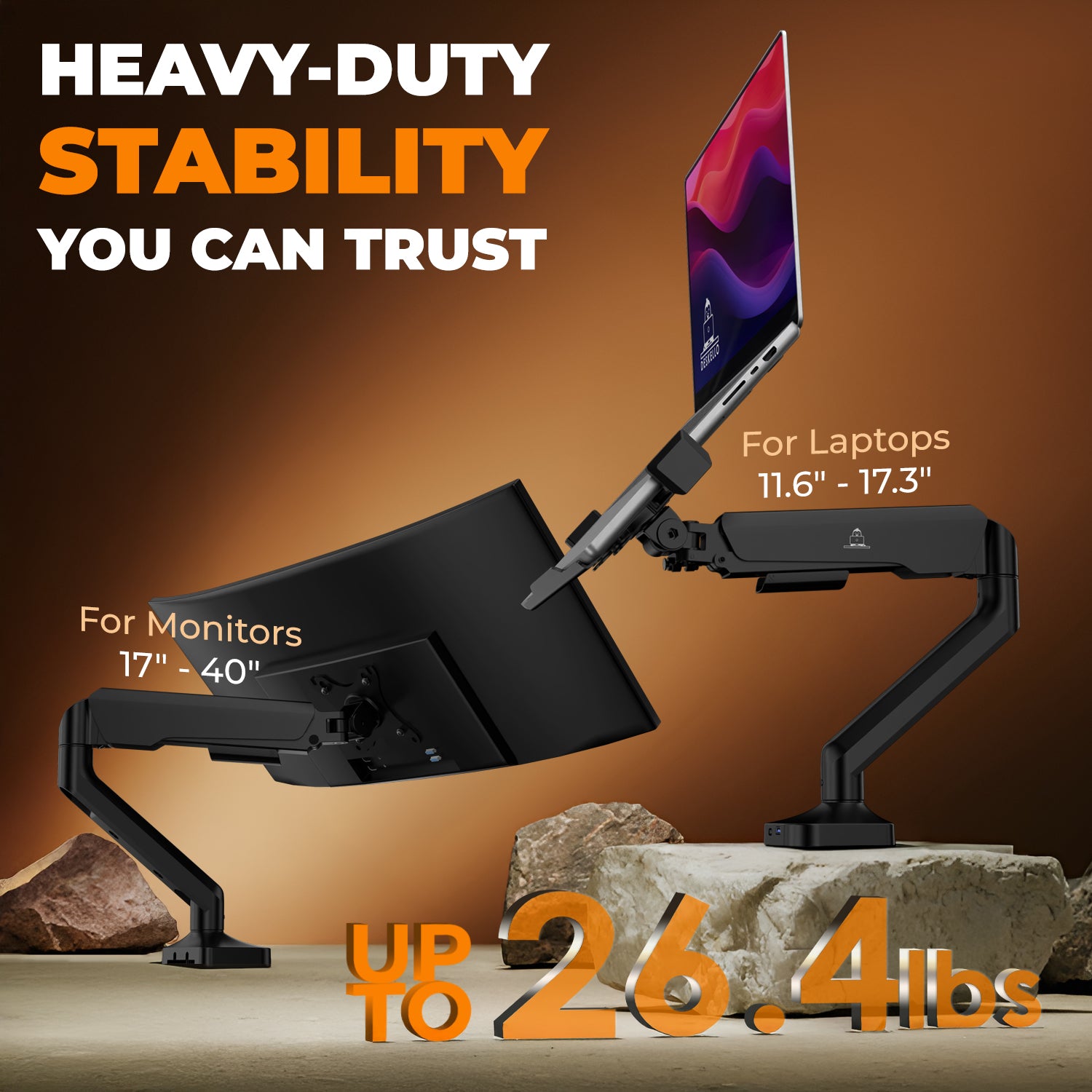 Heavy-duty mount that supports laptops from 11" to 17.3" and holds up to 26.4 lbs securely.